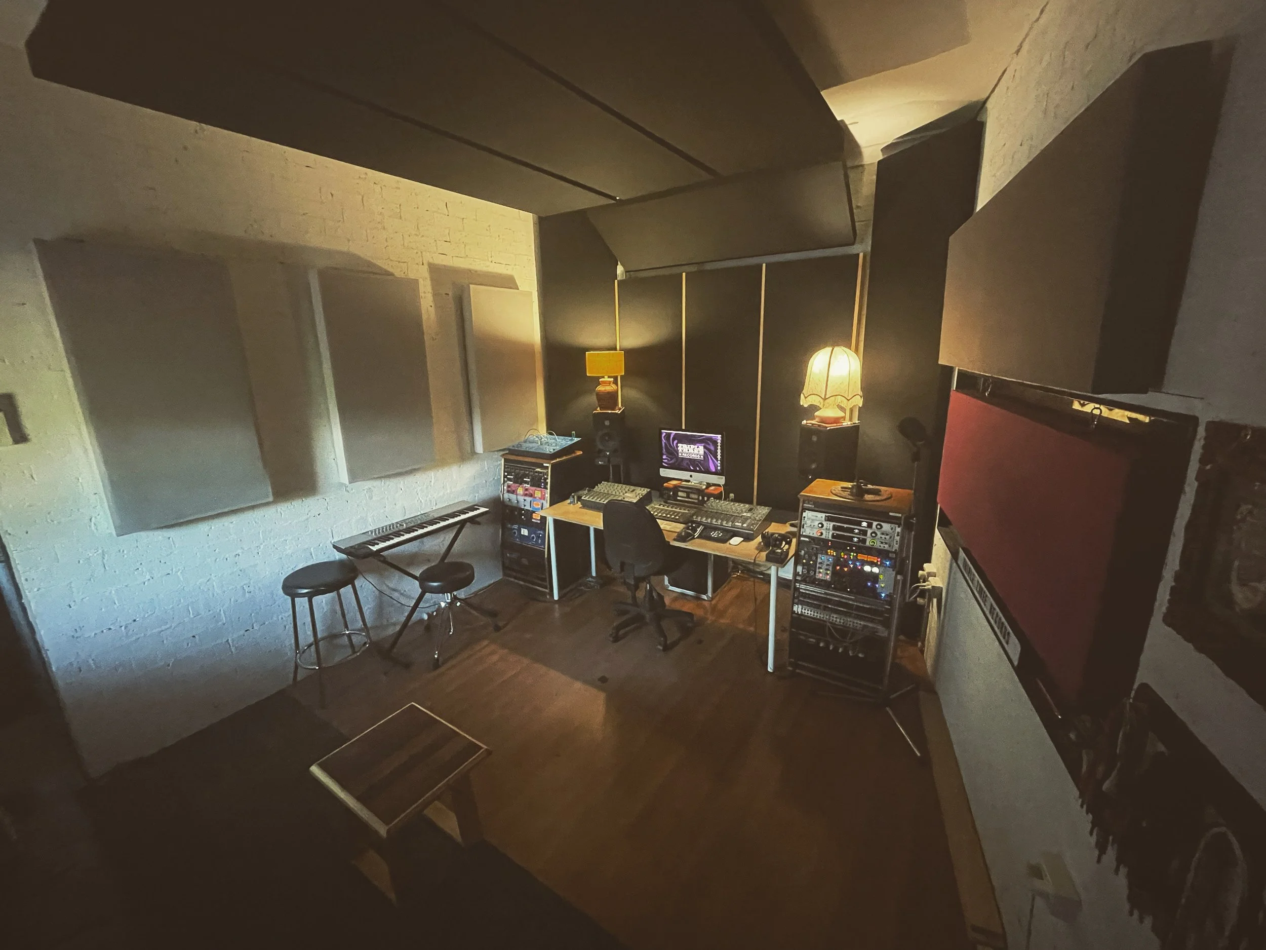 The live room and control room are acoustically treated for optimal sound.